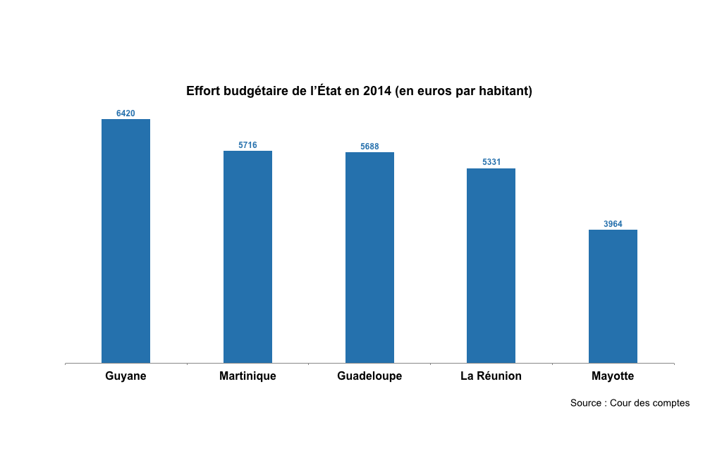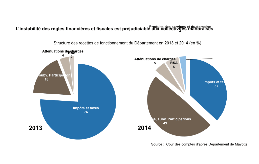 Pour les collectivités mahoraises, le passage à la fiscalité de droit commun constitue un profond bouleversement, mal anticipé. L’État a d’abord garanti leurs ressources au niveau de 2012, avant de revenir sur cet engagement fin 2014, laissant inachevé le schéma de financement du Département et des communes, s’agissant notamment de la répartition de l’octroi de mer. Les communes, dont la plupart ont fait l’objet d’une saisine de la chambre régionale des comptes par le préfet, sont dans une situation budgétaire difficile, alors même que, faute de maîtrise de leurs ressources fiscales, elles n’ont pas de visibilité sur leur financement futur. Par ailleurs, l’effort global de l’État en faveur de Mayotte est en augmentation sensible, passant de 680 M€ en 2010 à 889 M€ en 2014, sans que cette augmentation soit toujours liée au changement de statut. L’État paraît ainsi engagé dans une logique de rattrapage avec les autres départements d’outre-mer, sans l’avoir réellement programmée en termes budgétaires.
