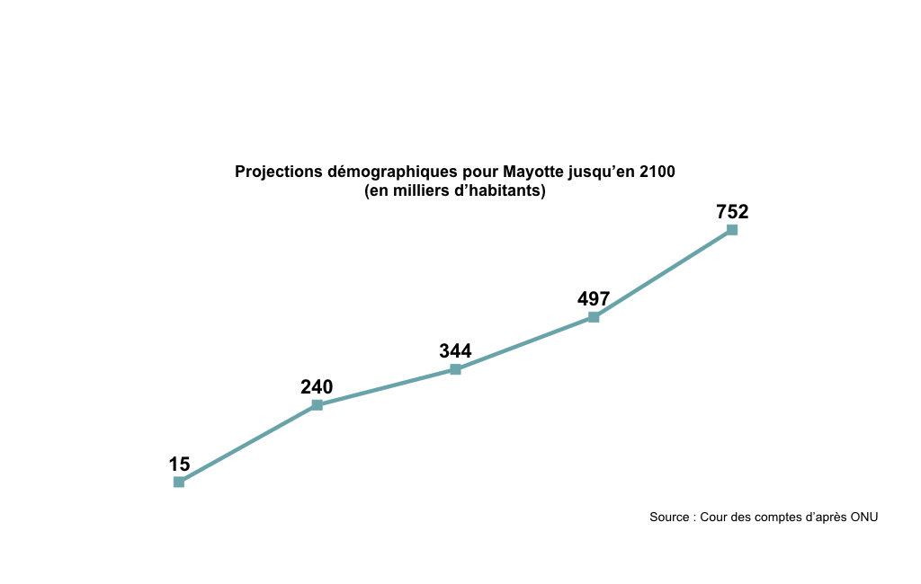 Estimée à 220 000 personnes au 1er janvier 2014, la population de Mayotte pourrait atteindre 500 000 habitants en 2050. Elle est très jeune et composée à 40 % d’étrangers, pour l’essentiel d’origine comorienne. L’ampleur de l’immigration irrégulière représente à Mayotte un défi spécifique pour l’ensemble des politiques publiques, de même que le taux de chômage, qui s’élève à plus de 36 %. Si le nouvel aéroport de Pamandzi, comme les investissements importants prévus en faveur du port de Longoni, présentent des opportunités de développement, ils ne peuvent à eux seuls résoudre ces problèmes, d’autant qu’ils devront faire l’objet d’un suivi rigoureux et être accompagnés d’investissements dans les infrastructures.